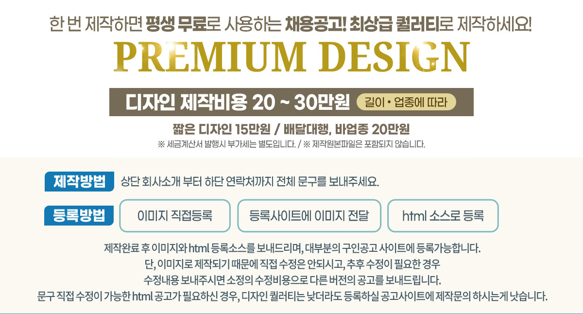 잡코리아, 사람인, 알바몬, 알바천국 등 주요 구인광고 사이트의 등록 규격과 사용자 반응을 기준으로 제작되었으며, 기업체, 배달라이더 모집, TM·콜센터, 보험업, 부동산업종, 매장 채용, 바·유흥업종, 프렌차이즈, 이벤트 등 다양한 업종의 채용 목적에 맞춰 구성과 메시지를 최적화한 디자인을 제작해드립니다.
